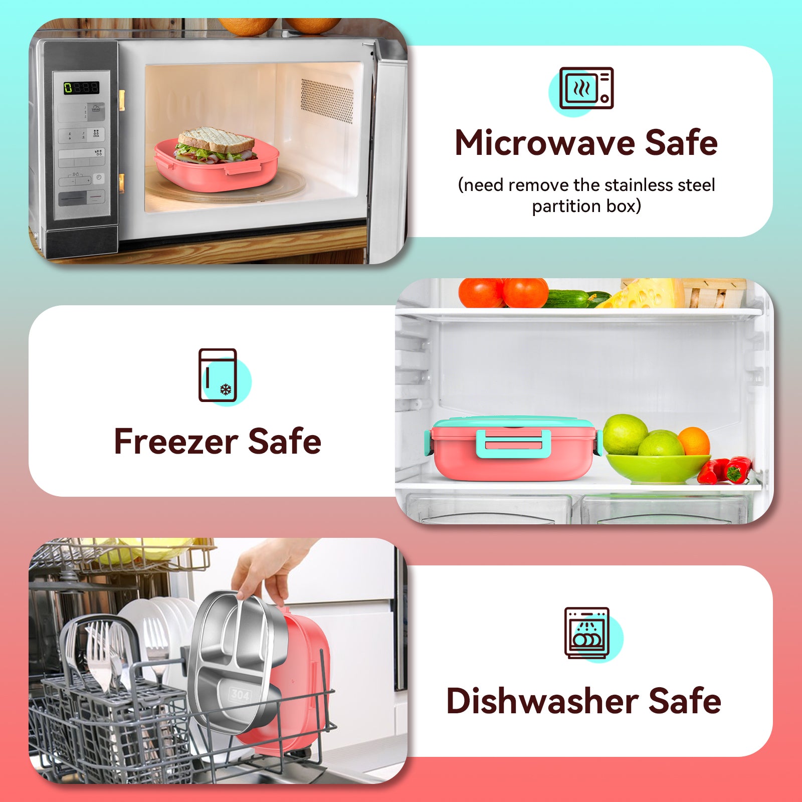- Dishwasher-safe for easy cleaning:This stainless steel lunch box is dishwasher safe,making clean-up a breeze and saving you precious time.(When you remove the stainless steel divider,you can heat food in the microwave).NOTE:The Bento Box doesn't have heat preservation function!!! It cannot keep the temperature warm for a long time. As time goes by, the food will get cold.