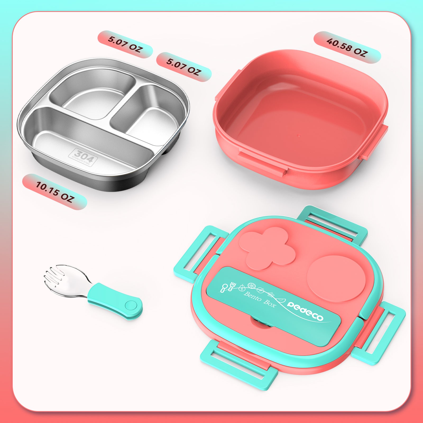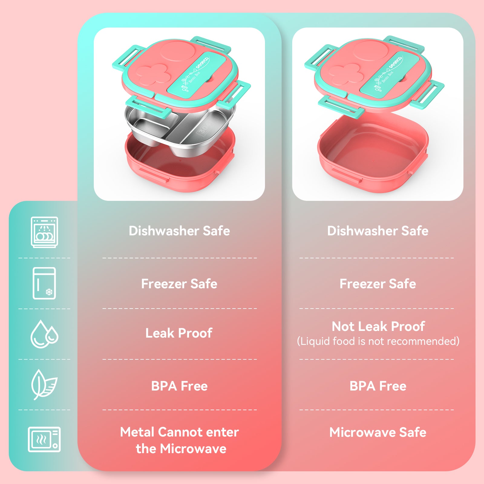 - Stylish and durable:Our bento box comes in a beautiful Pink that kids will love,while the stainless steel construction ensures long-lasting durability for daily use.Perfect for on-the-go:This lightweight and compact lunch box is designed for easy transportation,making it great for school,picnics,and outings.