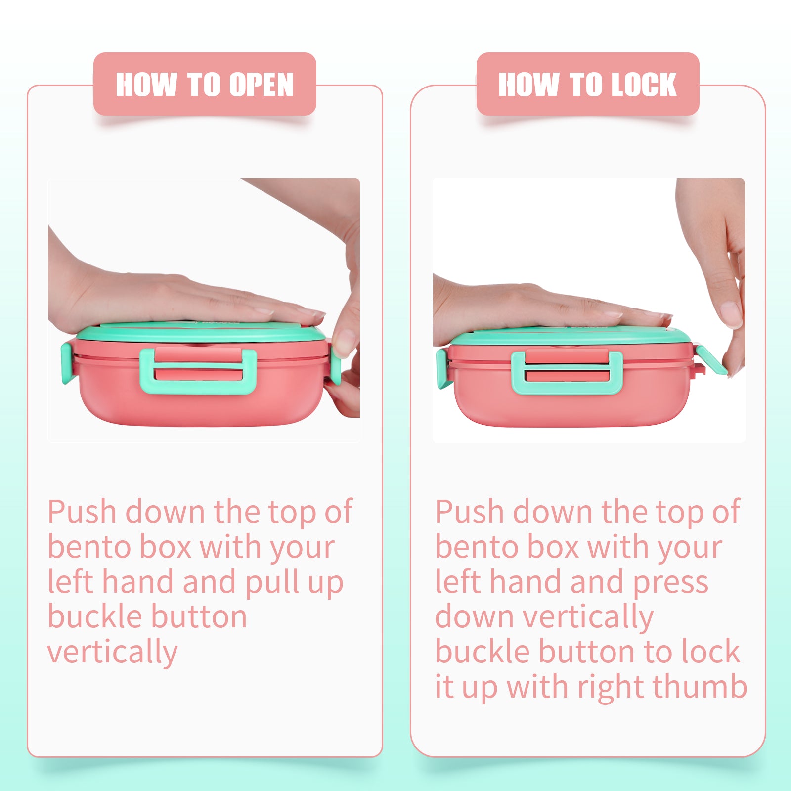 - Safety lock design:The unique 4-side lock mechanism ensures that the lunch box is tightly closed during transportation,effectively preventing food from leaking,allowing children to eat with peace of mind when going to school or playing outside.Safe and eco-friendly:Made from BPA-free,food-grade stainless steel 304,this lunch box is a healthy and environmentally friendly choice for your kids.